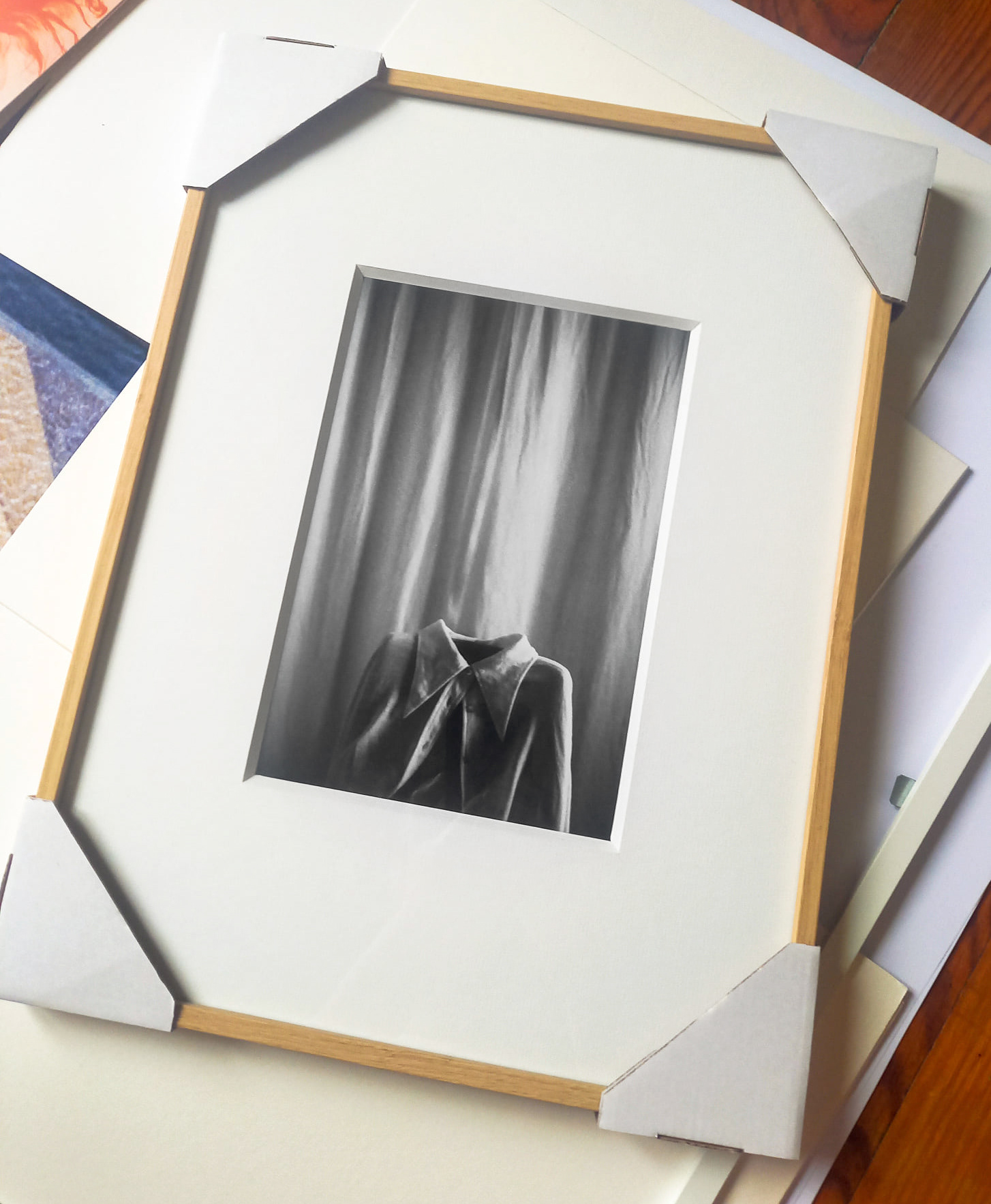 Sur demande, et après établissement d’un devis, le tirage peut être expédié monté sous passe-partout biseauté au pH neutre (1,4 mm ou 3,3 mm), encadré et/ou contrecollé sur un support rigide neutre.