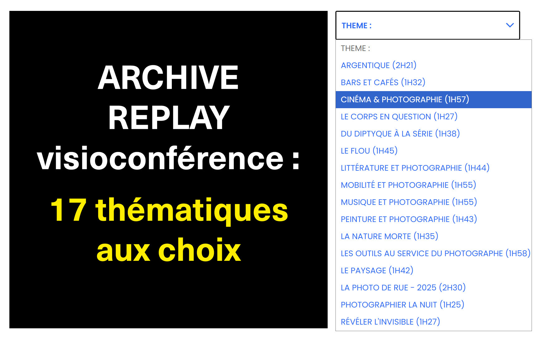 "Une possible histoire du portrait","Peinture & Photographie", "La photo de rue", "Scénographier son exposition photographique", "Le corps en question", "Littérature et photographie", "La question de l'intime", "Photographie & Surréalisme", "La nature morte photographique", "La question du support", "Le post-traitement, comment et jusqu'où ?", "L'inspiration en Photographie"...